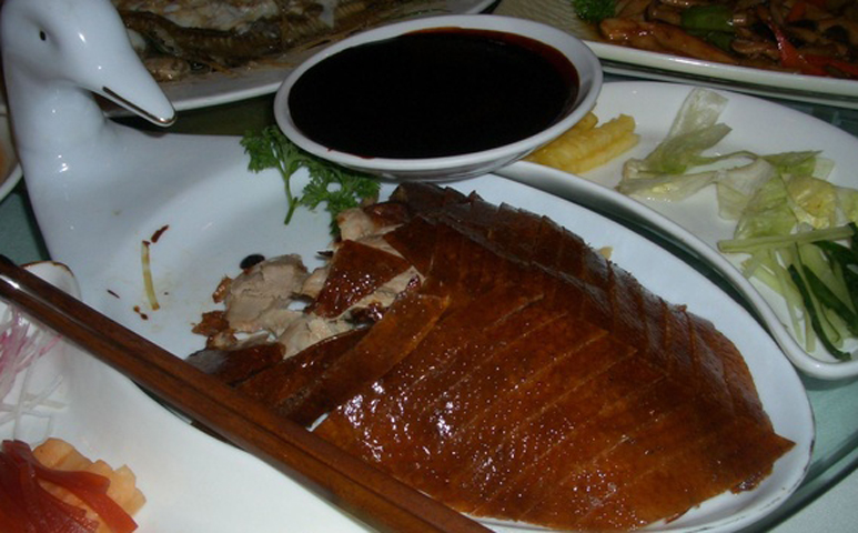 Arroz frito especial en cazuela. Ensalada de soja. Gambas rebozadas. Rollo de primavera. Pato laqueado pekinés con crepés.