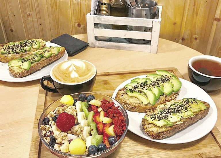 Tostada con aguacate y hummus. Smoothies. Zumos. Detox. Tarta de matcha con frutos rojos.
