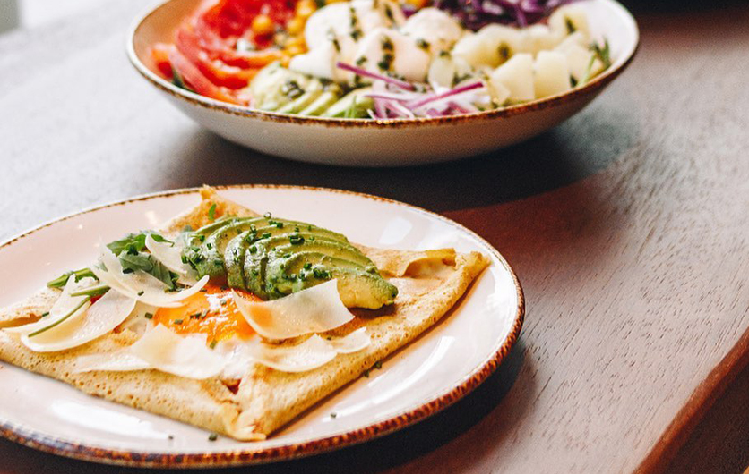 Pizza de huevos rotos. Galette de salmón y aguacate. Tosta con jamón y tomate. Gofre de aguacate, huevo y espinacas baby. Donut de boniato y coco. Muffin de chocolate con caramelo de chocolate. Bowl de mango. Chia pudding bowl.