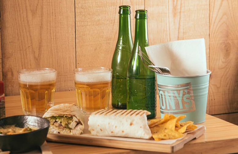 Ensalada Sony's César. Burritos. Crepes. Tarta del día. Batidos.