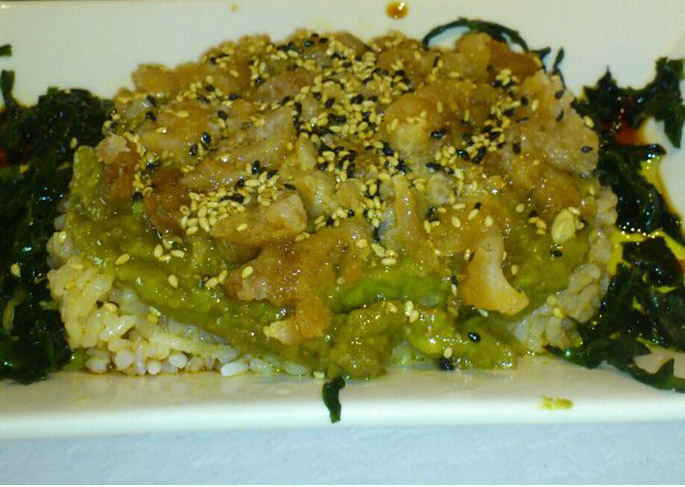 Sushi de atún con guacamole. Sashimi de ternera.