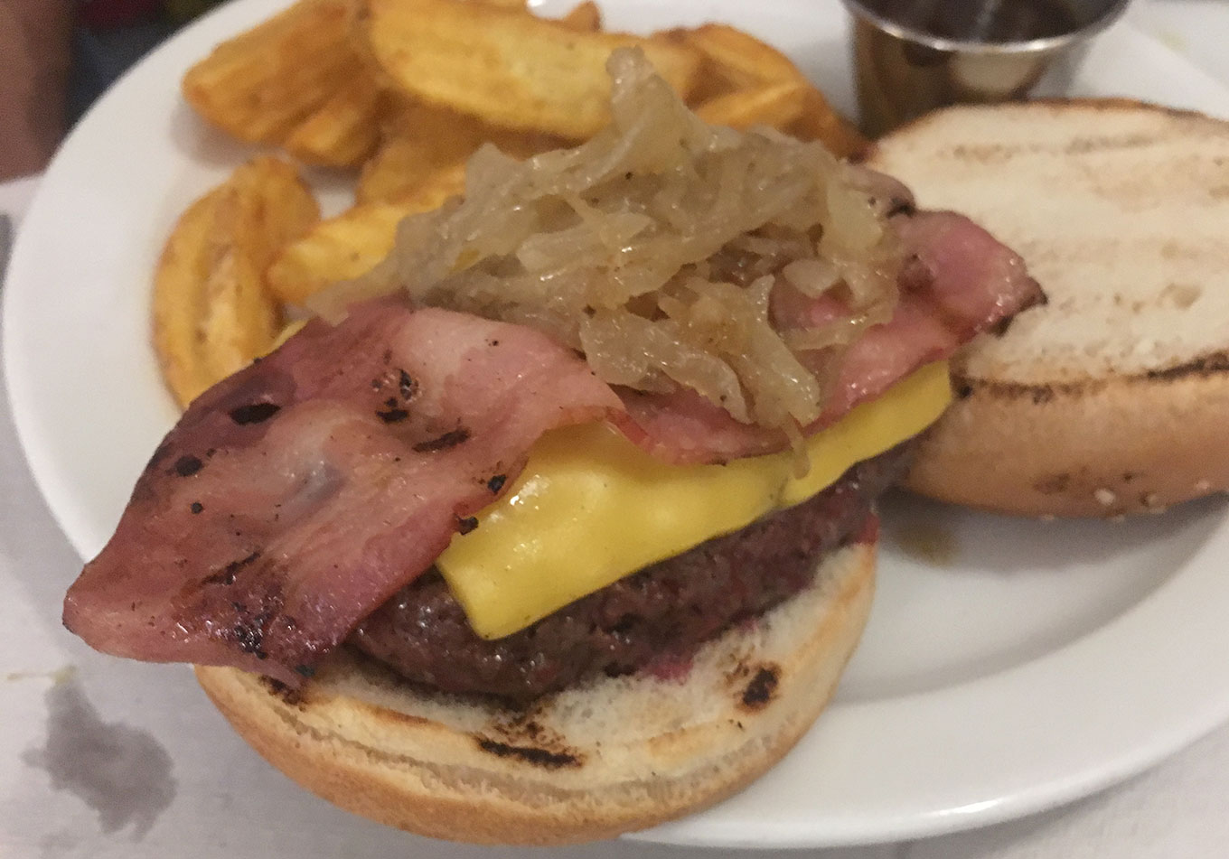 Pedimos dos clásicas de queso y bacón, una normal, pequeña de 160 gr. y otra super de 250 gr., las dos poco hechas. Para el tamaño super mejor pedirla al punto, vino demasiado poco hecha, menos cocinada que la pequeña por el grosor se convertía casi en un steak tartar y para comer steak tartar mejor irse a Sacha aunque salga el bolsillo bastante más resentido.